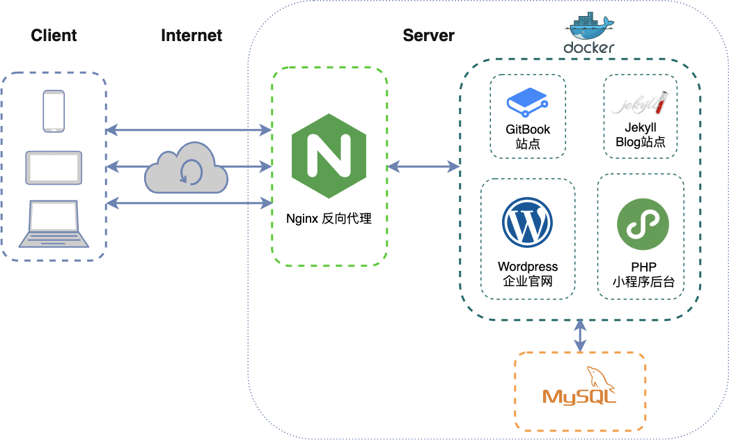 朋友“搞事情”,自己有偿帮忙搭了一套线上服务,包括官网、小程序后台、文档集站点、个人博客站点等。