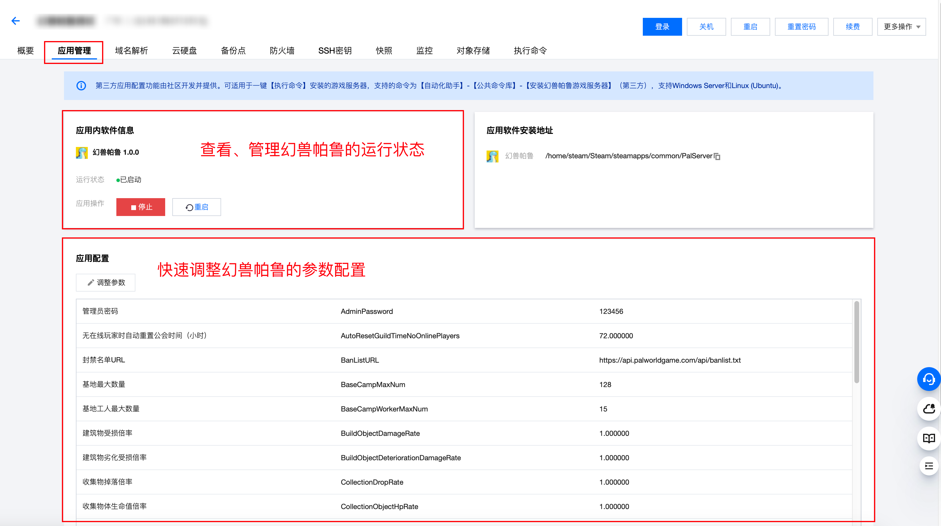 步骤二:在实例详情页点击“应用管理”,即可看到幻兽帕鲁的配置面板。