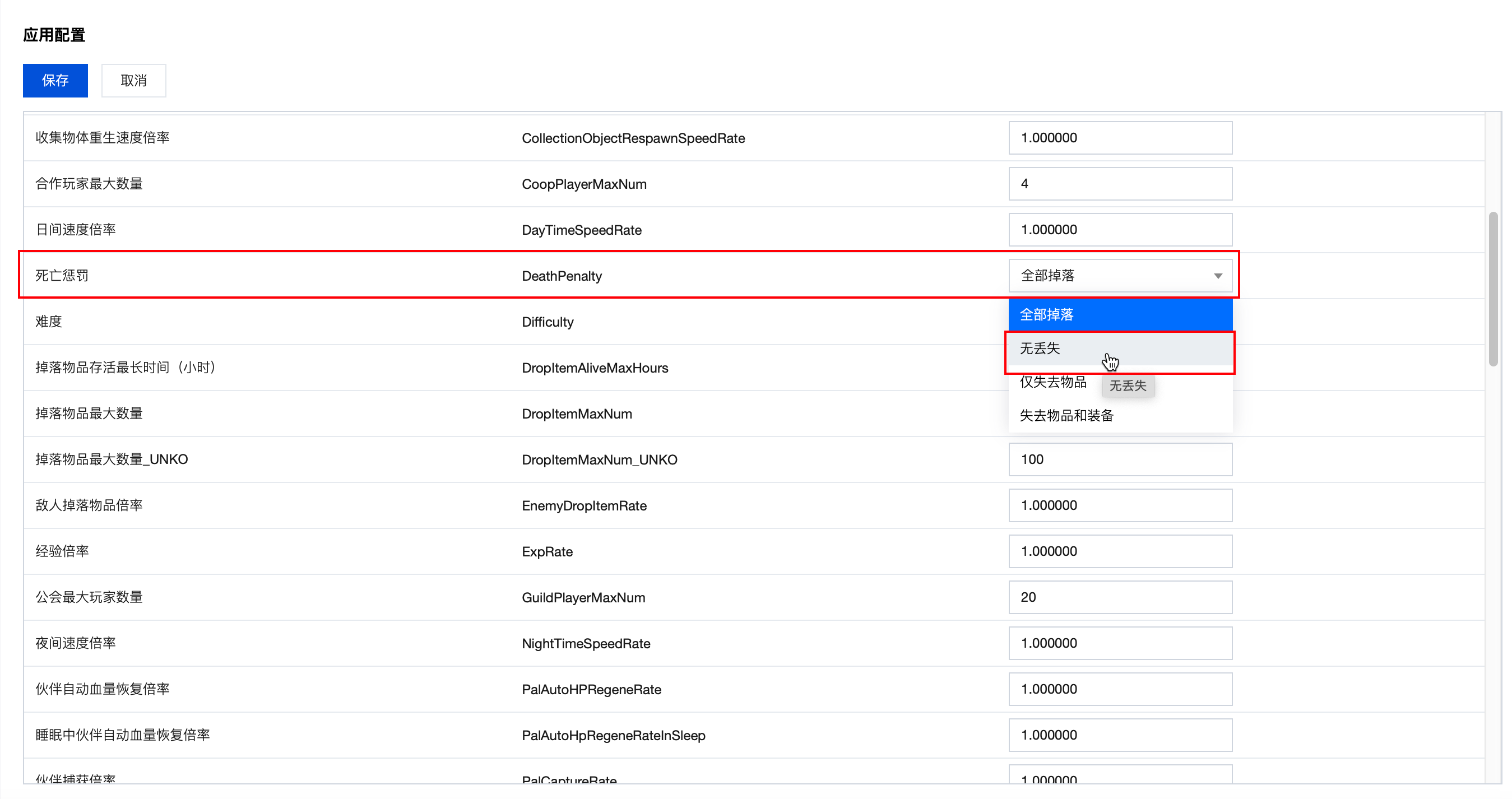 步骤一:单击面板内的【调整参数】按钮,即可在下方表格中开启编辑模式。找到“死亡惩罚”配置项,并将它的值修改为:无丢失。