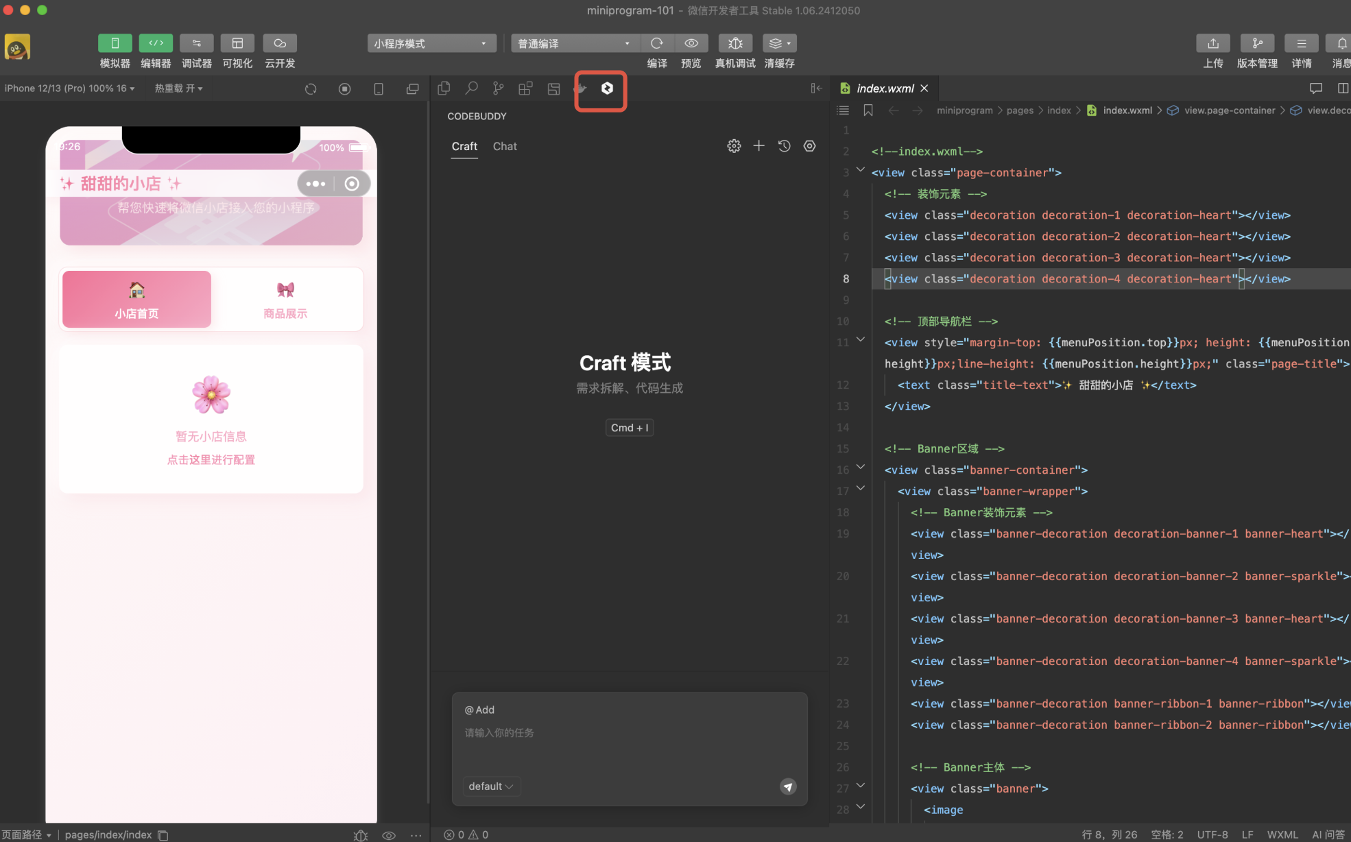 当出现了如下的图标,并出现 Craft 模式,说明 CodeBuddy 启动正常,你可以直接在输入框里输入需求啦。