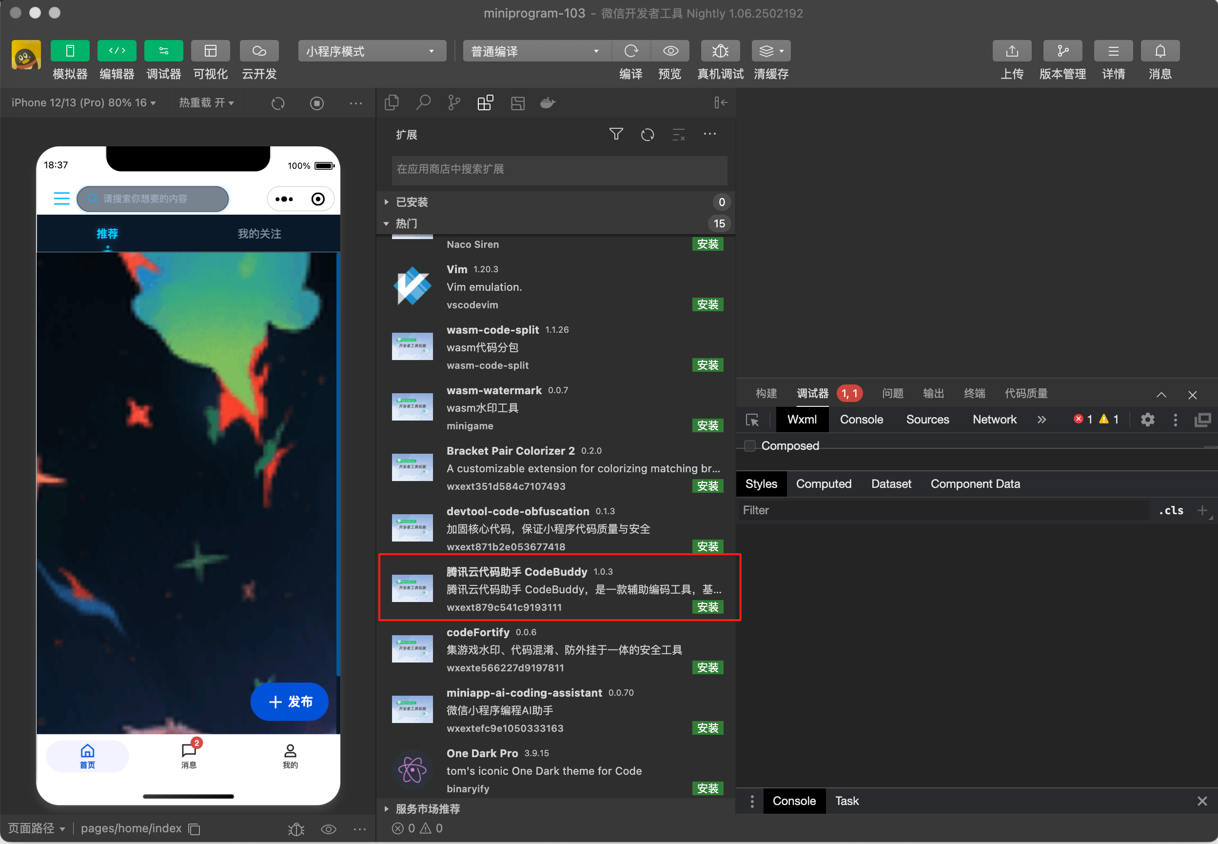 3. 安装腾讯云代码助手CodeBuddy 插件:点击扩展,选择腾讯云代码助手 CodeBuddy。这里最新版本到了 1.0.3,大家要注意选择最新版本哦。安装完后记得重启一下微信 IDE 开发者平台就可以了。