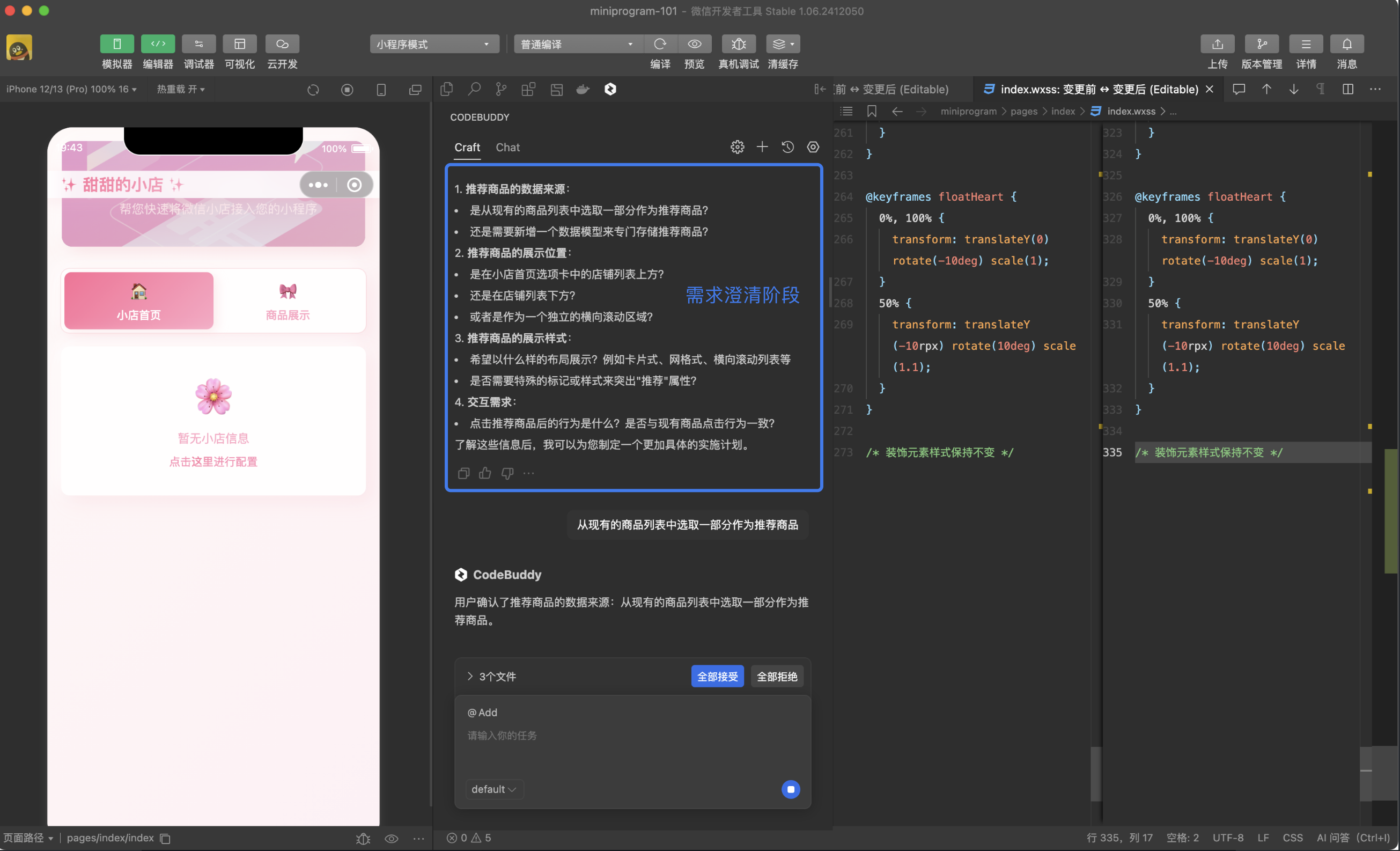 打开腾讯云代码助手CodeBuddy,默认就处在 Craft 模式下。你可以根据当前工程提出需求,我们会根据你的需求,拆解并生成小程序专属的代码。如果过程中需求不清晰, CodeBuddy会停止生成,进一步询问澄清,比如: