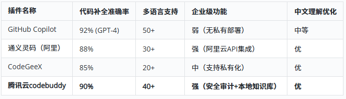 - 腾讯云CodeBuddy在代码补全准确率逼近Copilot(差距<2%),且显著优于其他国产工具;