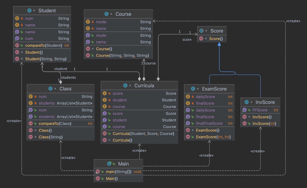 总体而言,这段代码实现了一个简单的成绩管理系统,可以通过输入课程和成绩信息来管理和计算学生的成绩。它使用了面向对象的设计思想,通过类的组织和关联来实现对不同实体的管理,并通过正则表达式匹配和条件判断来处理不同类型的输入信息。