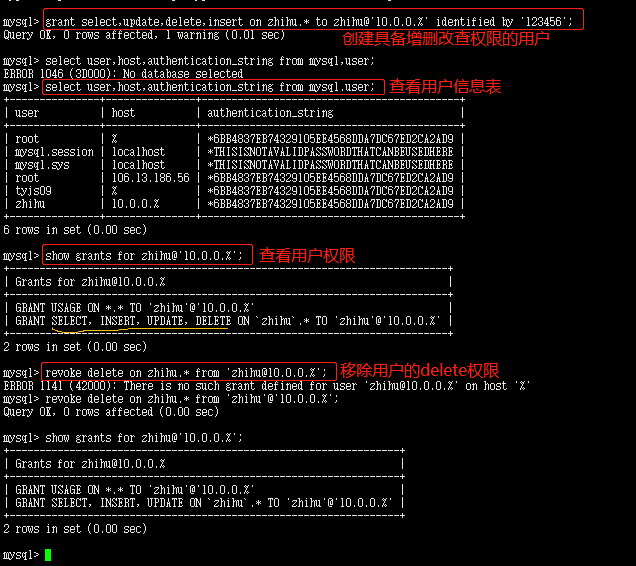 grant insert,delete,update,select on zhuhu.* to zhihu@’10.0.0.%’ identified by ‘123456’;