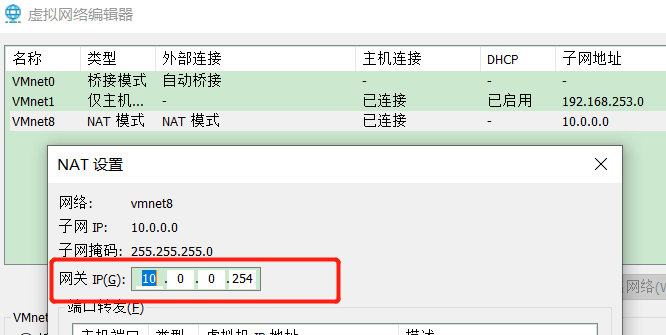 右键win10左下角---网络连接--双击VMnet8--属性--双击ipv4--将默认网关设置和上面一致