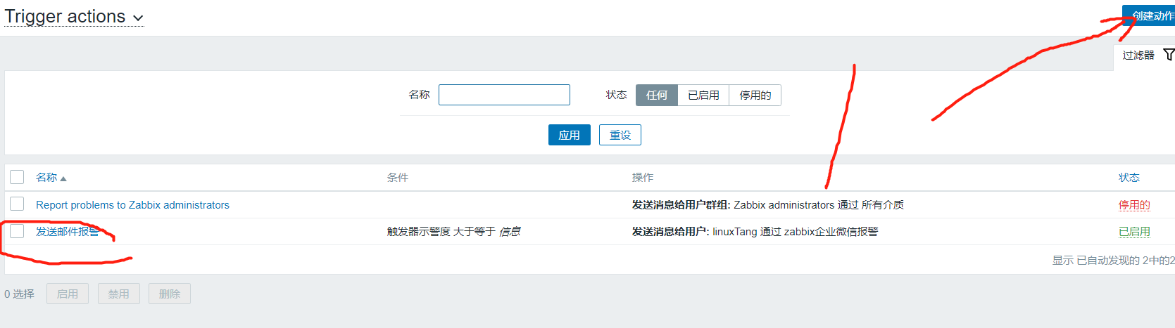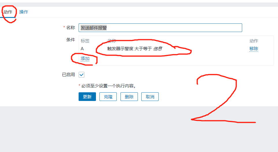 配置--动作--创建动作--添加触发条件--点击操作标签--设置操作类型和接收邮件的用户