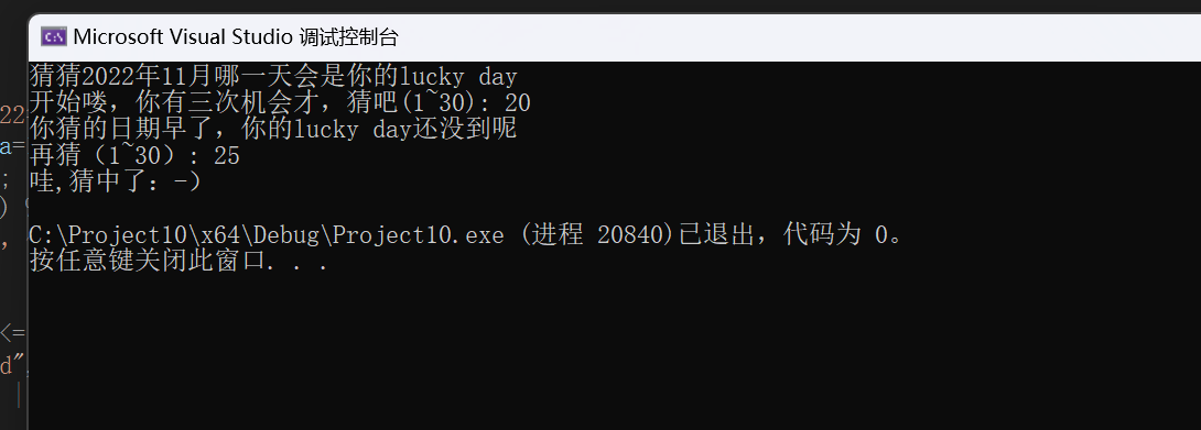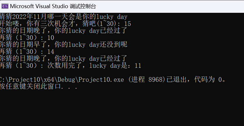 #include<stdio.h> #include<stdlib.h> #include<time.h> #define N 3 int main() { printf("猜猜2022年11月哪一天会是你的lucky day\n"); int i, number,a=1; srand(time(0)); number = rand() % 30 + 1; printf("开始喽,你有三次机会才,猜吧(1~30): "); for (a = 1; a <= N; a++) { scanf_s("%d", &i); if (i <= 0 || i >= 31) { printf("数据输入错误,请重新输入:"); } if (i < number&&i>0) { printf("你猜的日期早了,你的lucky day还没到呢\n"); printf("再猜(1~30): "); } else if(i>number&&i<31) { printf("你猜的日期晚了,你的lucky day已经过了\n"); printf("再猜(1~30): "); } else if(i==number) { printf("哇,猜中了:-)\n"); break; } } if(a>N) printf("次数用完了,lucky day是:%d\n", number); return 0; }