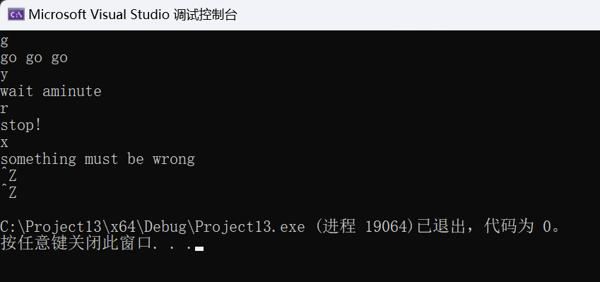 #define _CRT_SECURE_NO_WARNINGS #include<stdio.h> #include<stdlib.h> int main() { char ans; while (scanf("%c", &ans )!= EOF) { getchar(); switch (ans) { case 'r':printf("stop!\n"); break; case'g':printf("go go go\n"); break; case'y':printf("wait aminute\n"); break; default:printf("something must be wrong\n"); break; } } return 0; }
