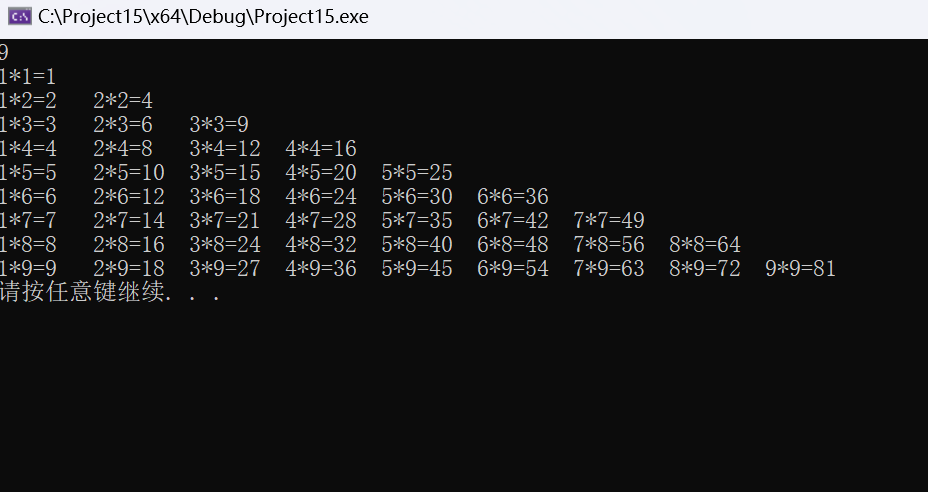 #define _CRT_SECURE_NO_WARNINGS #include<stdio.h> #include<stdlib.h> int main() { int i, line,m,j; scanf("%d", &line); for (i = 1; i <= line; i++) { if (line > 9 || line < 1) { printf("数据输入错误,请重新输入\n"); break; } for (j = 1; j <= i; j++) { m = j * i; printf("%d*%d=%d", j, i, m); printf("\t"); } printf("\n"); } system("pause"); return 0; }