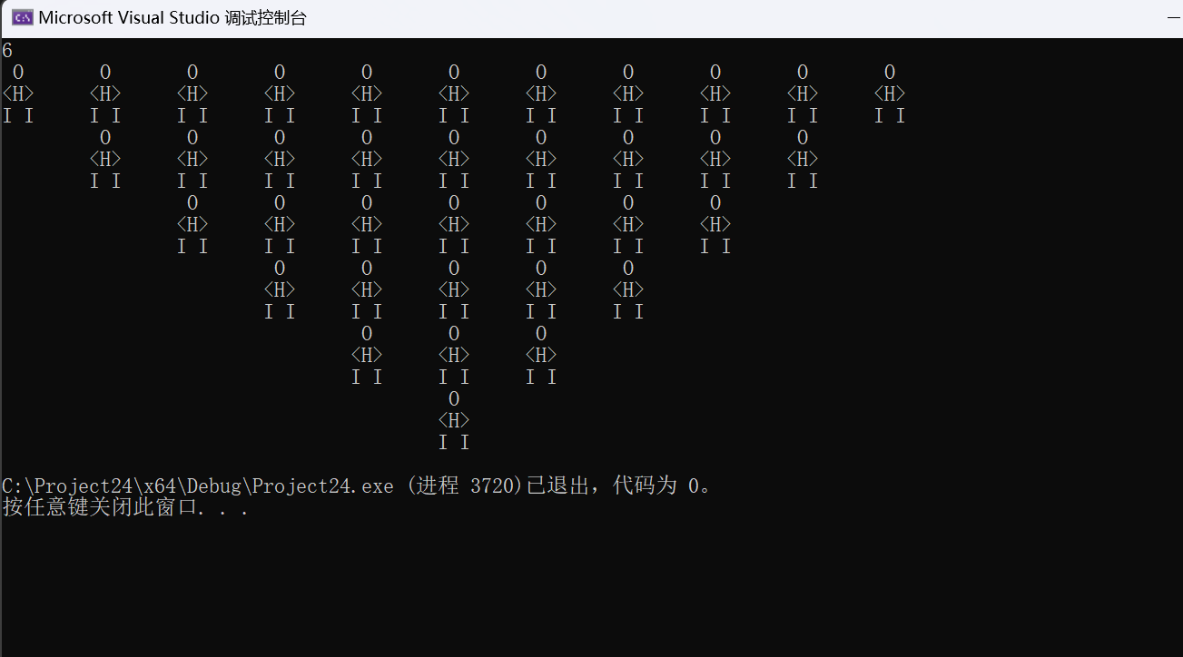 #define _CRT_SECURE_NO_WARNINGS #include<stdio.h> #include<stdlib.h> int main() { int i, n,j,m,h; scanf("%d", &n); m = 2 * n + 1; for (i = 1; i <= n; i++) { m = m - 2; for (h = 1; h < i; h++) { printf("\t"); } for (j = 1; j <= m; j++) { printf(" O \t"); } printf("\n"); for (h = 1; h < i; h++) printf("\t"); for (j = 1; j <= m; j++) { printf("<H>\t"); } printf("\n"); for (h = 1; h < i; h++) printf("\t"); for (j = 1; j <= m; j++) { printf("I I\t"); } printf("\n"); } return 0; }