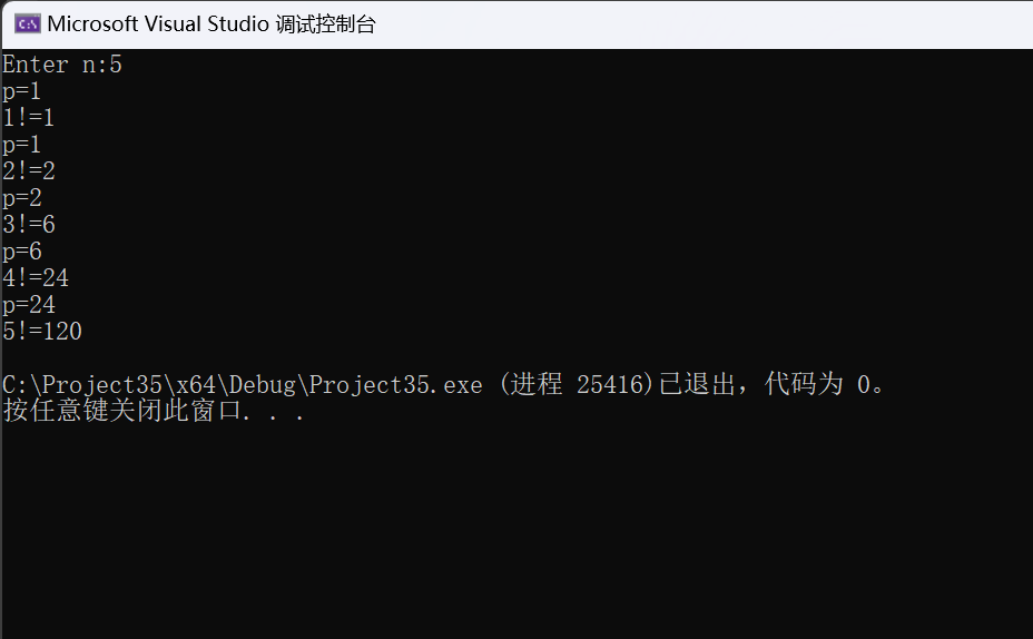 #define _CRT_SECURE_NO_WARNINGS #include<stdio.h> long long fac(int n); int main() { int i, n; printf("Enter n:"); scanf("%d", &n); for (i = 1; i <= n; i++) printf("%d!=%lld\n", i, fac(i)); return 0; } long long fac(int n) { static long long p = 1; printf("p=%lld\n", p); p = p * n; return p; }