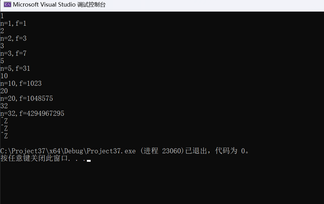 #define _CRT_SECURE_NO_WARNINGS #include<stdio.h> long long func(int n); int main() { int n; long long f; while (scanf("%d", &n) != EOF) { f = func(n); printf("n=%d,f=%lld\n", n, f); } return 0; } long long func(int n) { if (n ==0) return 0; else if (n == 1) return 1; else return 2 * func(n - 1) + 1; }