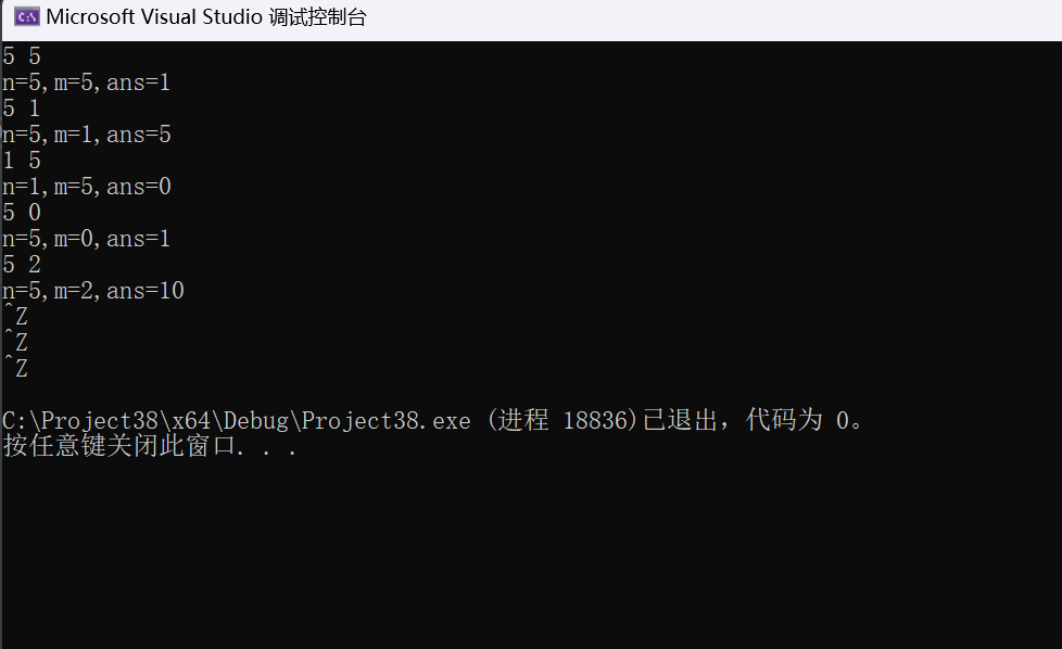 #define _CRT_SECURE_NO_WARNINGS #include<stdio.h> int func(int n, int m); int main() { int n, m; while (scanf("%d%d", &n, &m) != EOF) printf("n=%d,m=%d,ans=%d\n", n, m, func(n, m)); return 0; } int func(int n, int m) { if (n == m||m==0) return 1; if (m > n) return 0; return func(n - 1, m) + func(n - 1, m - 1); }