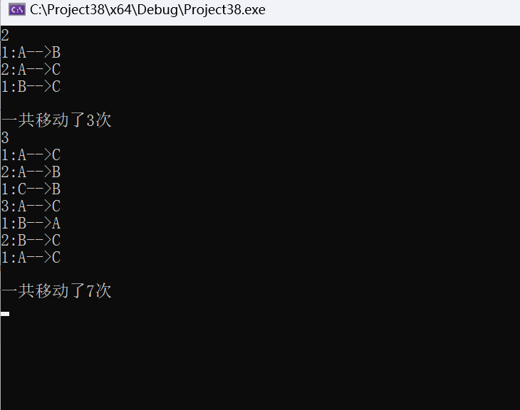 #define _CRT_SECURE_NO_WARNINGS #include<stdio.h> #include<stdlib.h> #include<math.h> void hanoi(unsigned int n, char from, char temp, char to); void moveplate(unsigned int n, char from, char to); int main() { unsigned int n,m; while (scanf("%u", &n) != EOF) { hanoi(n, 'A', 'B', 'C'); m = pow(2, n) - 1; printf("\n"); printf("一共移动了%d次\n", m); } system("pause"); return 0; } void hanoi(unsigned int n, char from, char temp, char to) { if (n == 1) moveplate(n, from, to); else { hanoi(n - 1, from, to, temp); moveplate(n, from, to); hanoi(n - 1, temp, from, to); } } void moveplate(unsigned int n, char from, char to) { printf("%u:%c-->%c\n",n,from,to); }