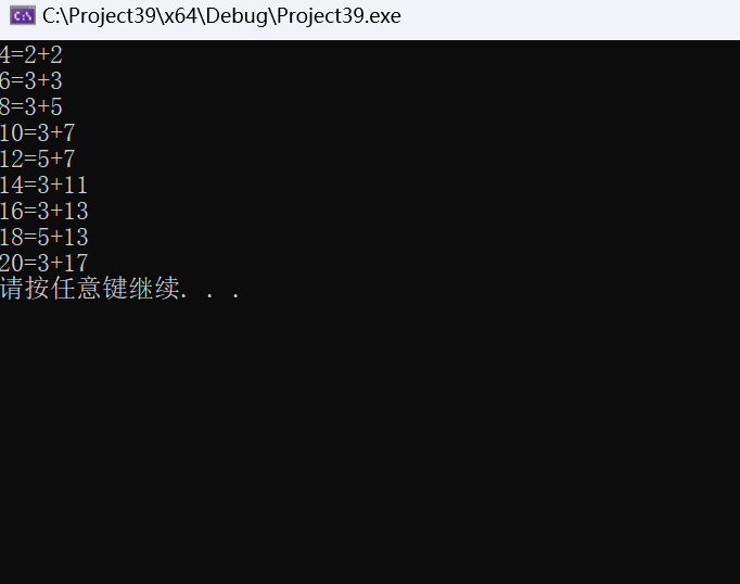 #include<stdio.h> #include<stdlib.h> int is_prime(int n); int main() { int i,n; for (i = 4; i <= 20; i=i+2) for (n = 2; n <= i / 2; n++) if (is_prime(n) && is_prime(i - n)) { printf("%d=%d+%d\n", i, n, i - n); break; } system("pause"); return 0; } int is_prime(int n) { int i; for (i = 2; i <= n / 2; i++) { if (n % i == 0) break; } if (i > n / 2 && n > 1) return 1; else return 0; }