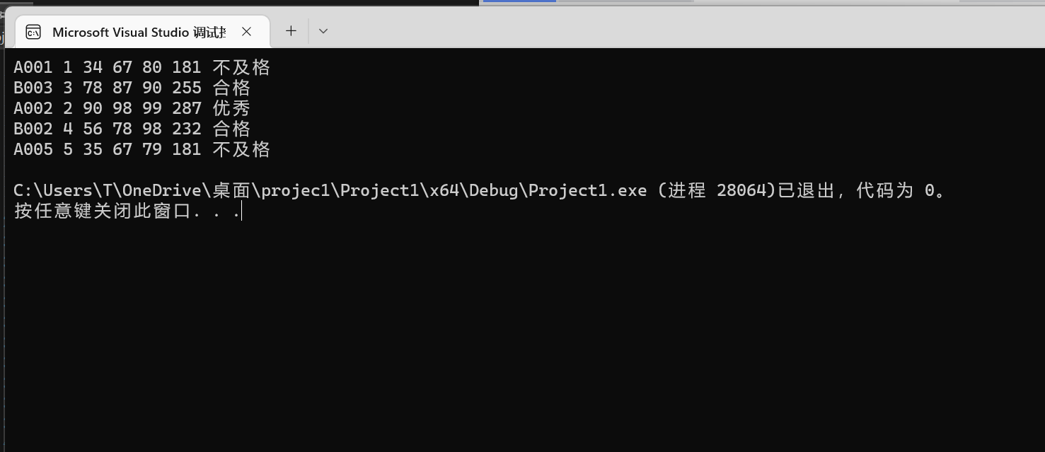 #define _CRT_SECURE_NO_WARNINGS #include<stdio.h> #include <stdio.h> #include <string.h> #define N 5 typedef struct student { char name[10]; int num; int maths; int computer; int english; int sum; char level[10]; } STU; void fun(STU a[], int n); // 函数声明 int main() { STU s[6 * N] = { {"A001", 1, 34, 67, 80}, {"B003", 3, 78, 87, 90}, {"A002", 2, 90, 98, 99}, {"B002", 4, 56, 78, 98}, {"A005", 5, 35, 67, 79} }; int i; fun(s, N); for (i = 0; i < N; i++) printf("%s %d %d %d %d %d %s\n", s[i].name, s[i].num, s[i].maths, s[i].computer, s[i].english, s[i].sum, s[i].level); return 0; } // 函数定义 void fun(STU a[], int n) { int i, j, max, min; for (i = 0; i < n; i++) a[i].sum = a[i].maths + a[i].computer + a[i].english; max = min = a[0].sum; for (i = 0; i < n; i++) { if (a[i].sum >= max) max = a[i].sum; else if (a[i].sum < min) min = a[i].sum; } for (i = 0; i < n; i++) { if (a[i].sum == max) strcpy(a[i].level, "优秀"); else if (a[i].sum == min) strcpy(a[i].level, "不及格"); else strcpy(a[i].level, "合格"); } }