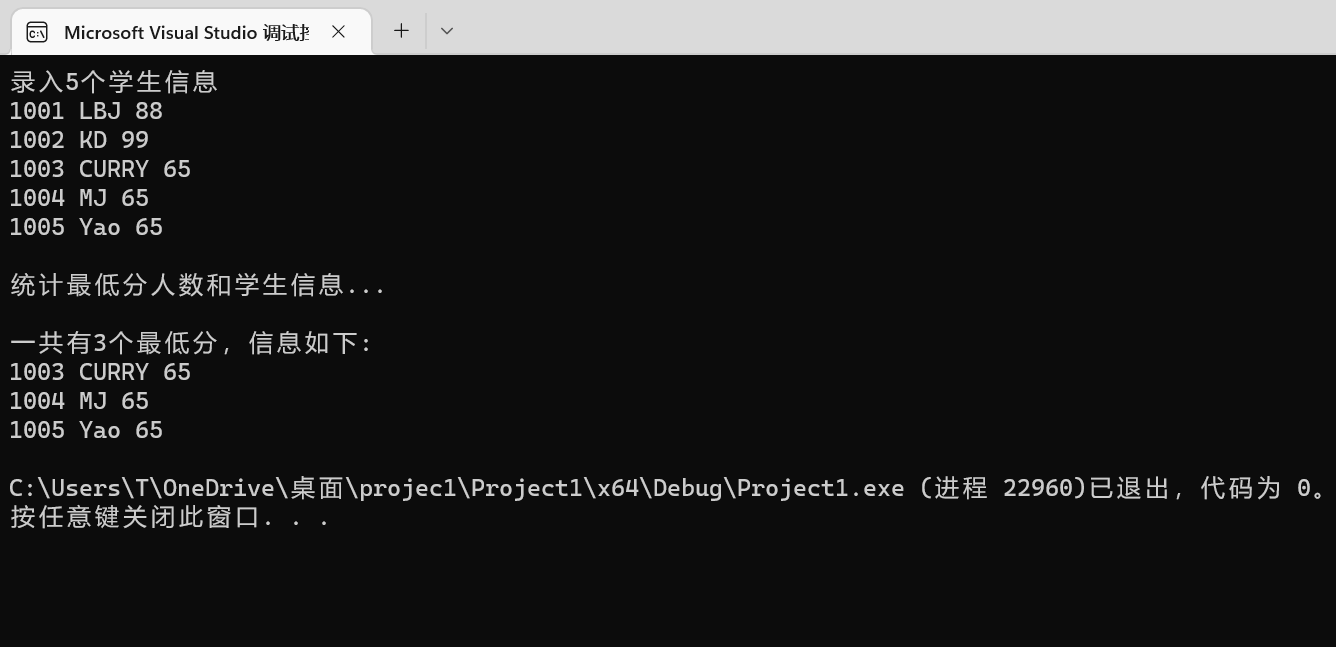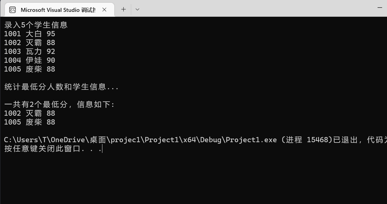 #define _CRT_SECURE_NO_WARNINGS #include<stdio.h> #define N 5 // 定义结构体类型struct student, 并定义STU为其别名 typedef struct student { long no; char name[20]; int score; } STU; // 函数声明 void input(STU s[], int n); int find_min_list(STU s[], STU t[], int n); void output(STU s[], int n); int main() { STU stu[N], min_list[N]; int count; printf("录入%d个学生信息\n", N); input(stu, N); printf("\n统计最低分人数和学生信息...\n"); count = find_min_list(stu, min_list, N); printf("\n一共有%d个最低分,信息如下:\n", count); output(min_list, count); return 0; } // 输入n个学生信息,存放在结构体数组s中 void input(STU s[], int n) { int i; for (i = 0; i < n; i++) scanf("%ld %s %d", &s[i].no, s[i].name, &s[i].score); } // 输出结构体s中n个元素信息 void output(STU s[], int n) { int i; for (i = 0; i < n; i++) printf("%ld %s %d\n", s[i].no, s[i].name, s[i].score); } // 在结构体数组s中,查找最低分学生的记录,将其存入结构体数组t中 // 形参n是结构体数组s中元素个数 // 函数返回最低分的学生人数 int find_min_list(STU s[], STU t[], int n) { int i, j = 0; int min=s[0].score; for (i = 0; i < n; i++) if (s[i].score < min) min = s[i].score; for(i=0;i<n;i++) if (s[i].score == min) { t[j] = s[i]; j++; } return j; }
