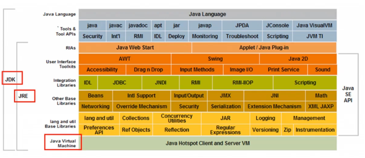 JRE:Java Runtime Environment,Java 运行时环境,主要包含两个部分,jvm 的标准实现和 Java 的一些基本类库。它相对于 jvm 来说,多出来一部分的 Java 类库。