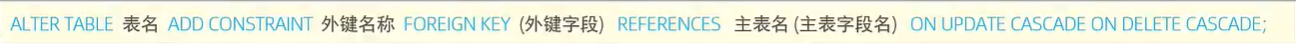 ALTER TABLE表名ADD CONSTRAINT外键名称FOREIGN KEY (外键字段) REFERENCES 主表名(主表字段名) ON UPDATE CASCADE ON DELETE CASCADE;