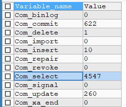 可以看到当前表各种语句执行的次数,Select语句占比多少,可以作为SQL调优的依据。配合慢查询日志