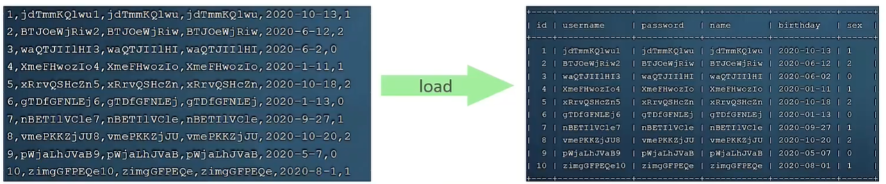 #客户端连接服务器时,加上参数 --local-infile mysql --local-infile -u root -p; #设置全局参数local_infile = 1 set global local_infile = 1 #执行load指令,将准备好的数据加载到本地表中, 引号中依次为 ‘文件路径’,‘表名’,‘分隔符’,‘行分隔符’ load data local infile '/root/sql1.log' into table 'tb_user' fields terminated by ',' lines terminated by '\n'
