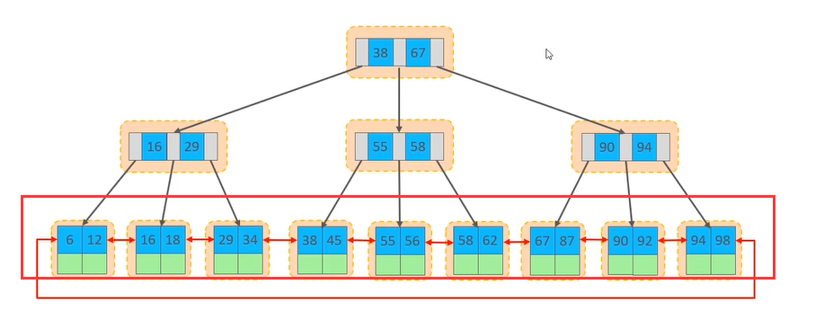 下图可以看到在聚簇索引B+树的结构中,行数据都是按照主键顺序存放的
