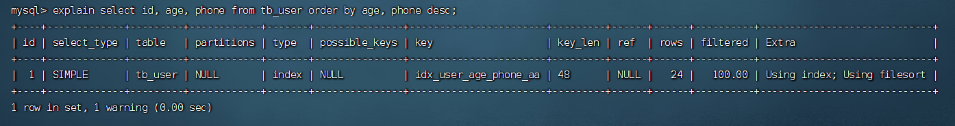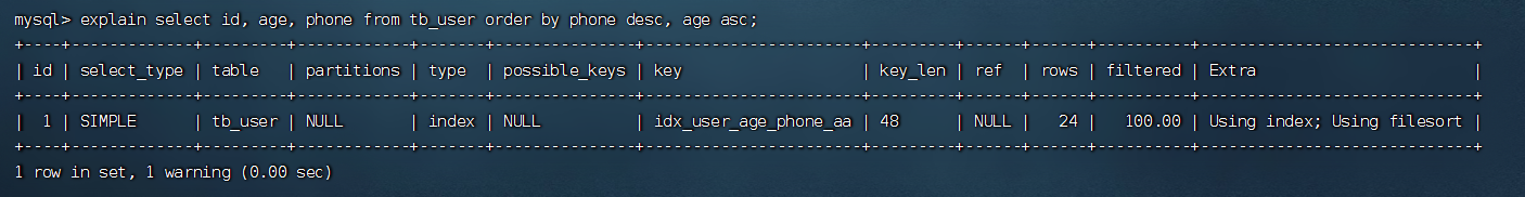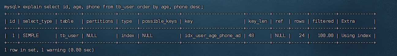 (3)、再次利用explain性能分析一条order by语句,按照age和phone升序排序,Extra中写的是Using index