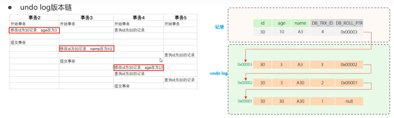 二、undo log:回滚日志,在insert,update,delete的时候产生的便于数据回滚的日志。当insert的时候,产生的undo log只在回滚时需要,在事务被提交后,可立即被删除。而update,delete的时候,产生的undo log日志不仅在回滚时需要,在快照读时也需要,不会立即被删除。不同事务或相同事务对同一条记录进行修改,会导致该记录的undo log生成一条版本链表,链表的头部是最新的旧记录,链表尾部是最早的旧记录。