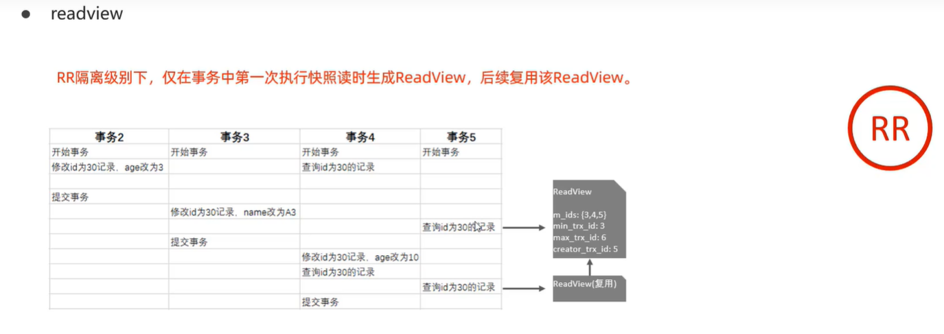 三、readView : ReadView读视图是快照都SQL执行时MVCC提取数据的依据,记录并维护系统当前活跃的事务(未提交的)id,ReadView中包含四个核心字段