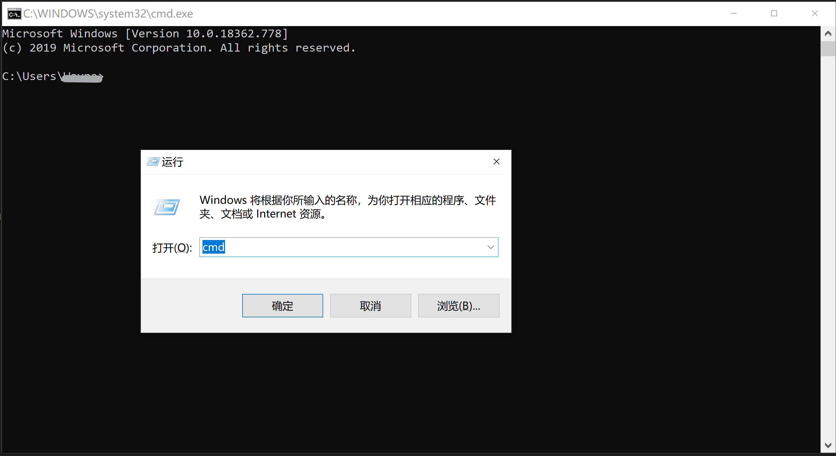 "Win+R"打开运行窗口,输入cmd进入dos命令窗口