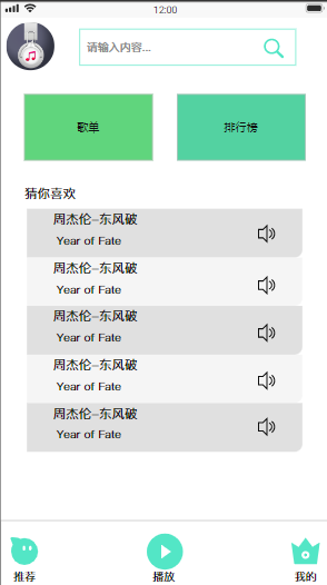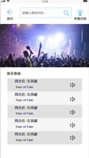 界面组成:歌曲搜索、听歌识曲、推荐歌曲。