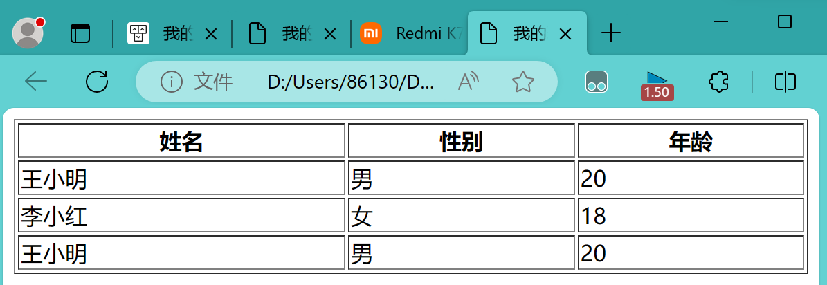 <th>姓名</th><th>性别</th><th>年龄</th>