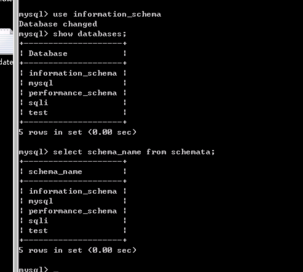 可以看到他们的作用是一样的,都是列出所有数据库,跟我们前面说的一样,SCHEMA_NAME字段保存了所有的数据库名。