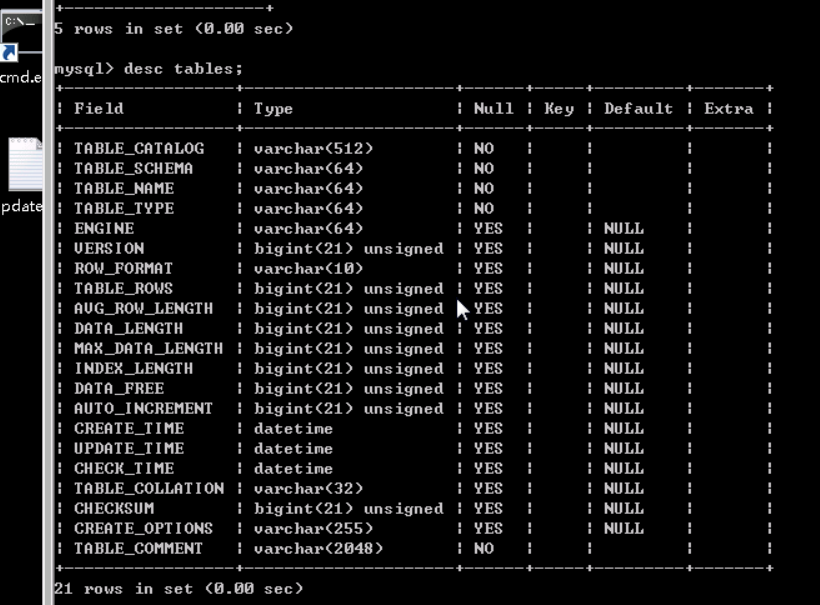 desc 可以用来看表结构。看下tables的表结构,执行desc tables;,结果如下图: