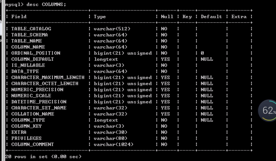 幸运的是,在information_schema数据库中,同样存在一个表,它保存了整个数据中,所有的列名,这个表就是COLUMNS。同样先查看该表结构。