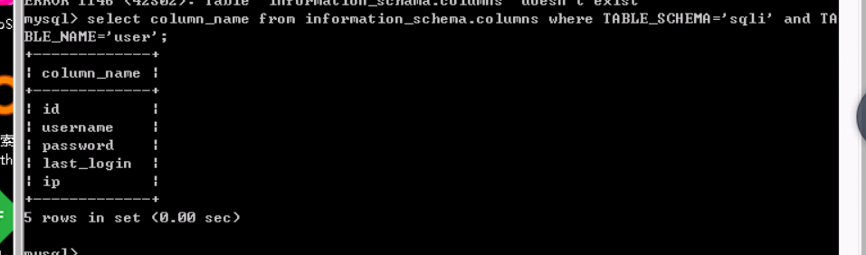 查看sqli的user表是否存在该字段,执行SQL语句:show columns from sqli.user;