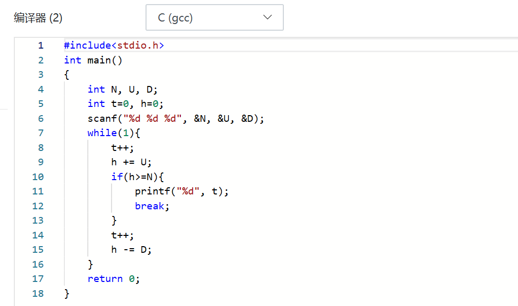 - 答案正确;有查询问题。当虫还未爬出时,记录上爬时间t++,h+=U虫上爬的距离和;如果上爬距离不小于N,输出时间t;然后记录休息的时间t++,h-=D虫减去下滑的距离,为虫移动的总距离。