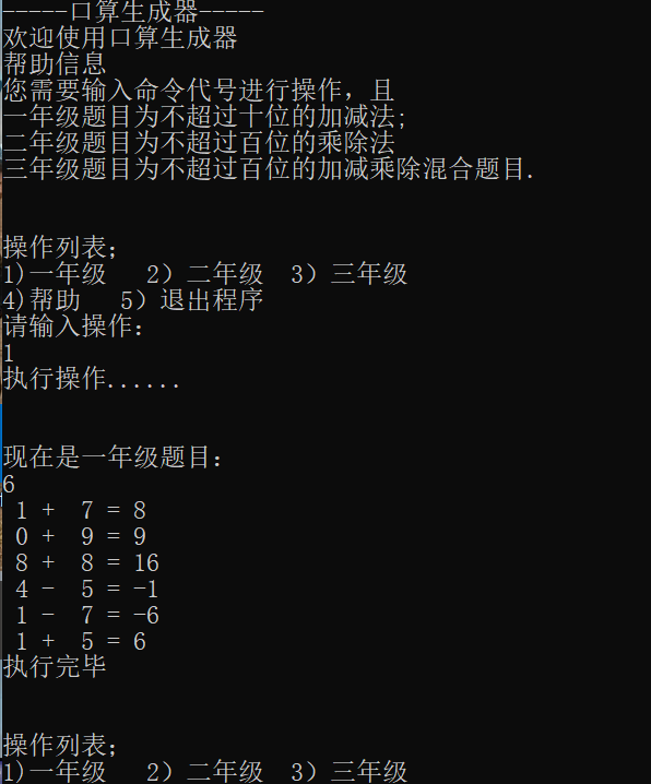 | 我在这个作业的目标是 | 使用上次作业的菜单框架,并在其基础上增加各年级题目的答案函数 |