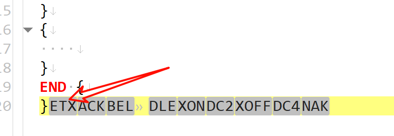 上图中这些灰色底色的字符,就是以十六进制编辑方式插入的控制字符,如果没有打开控制字符选项,这些字符不可见。