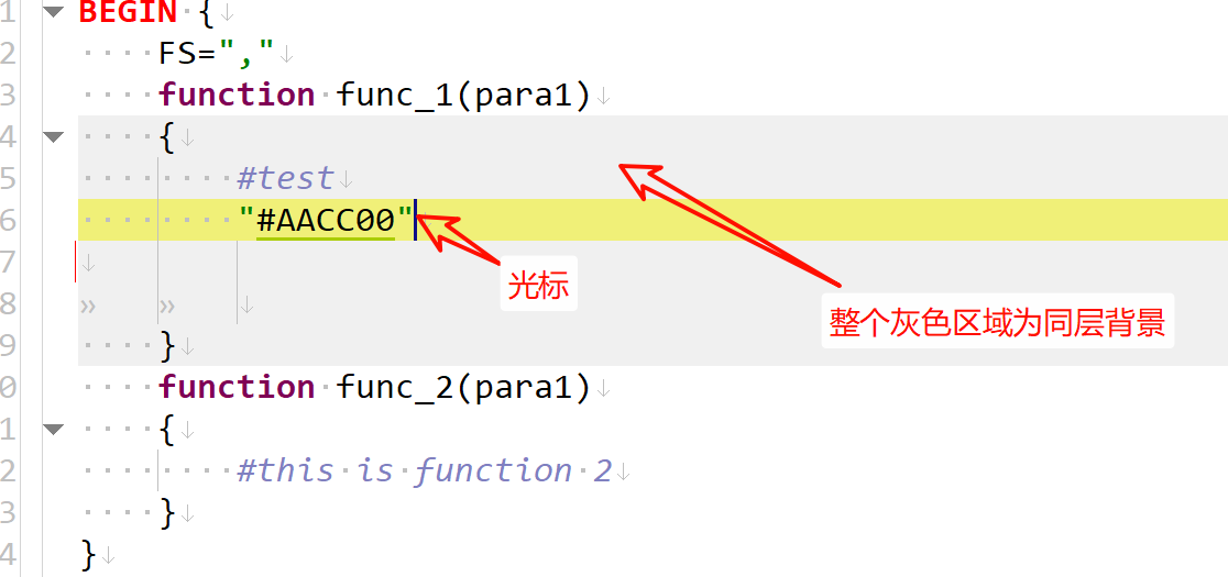 打开该选项时,会将光标所在层级全部使用颜色标注,如下图所示: