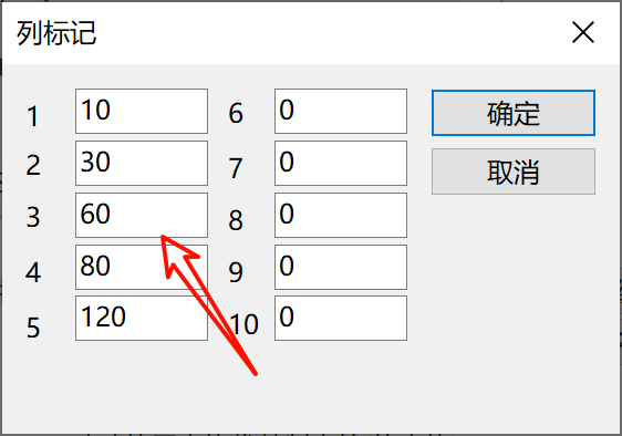 在弹出的“列标记”对话框中,输入需要显示列标记的列位置,最大支持显示10个列位置,如下图所示: