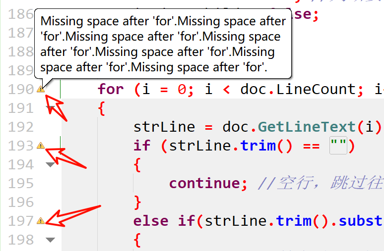 在进行代码检查时,可以在对应行显示错误信息,比如,使用EverEdit自带的JS模式下的JsLint功能,检查代码出现错误后,鼠标放在图标上会显示错误信息,如下图所示: