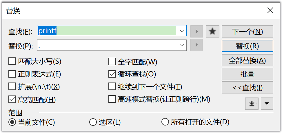 :当前文件搜索替换完了后,会在下一个打开的文件中继续搜索和替换。