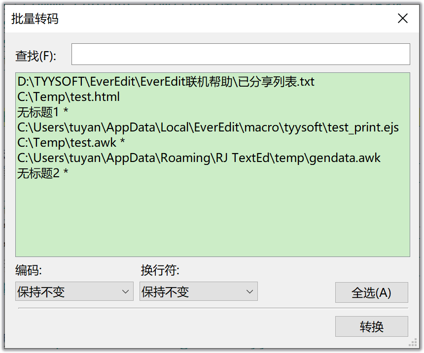 如果用户批量在Windows编辑文件,要上传到异构系统,如:Linux,则需要批量转换编码和换行符,此时可以使用EverEdit的批量转码功能。