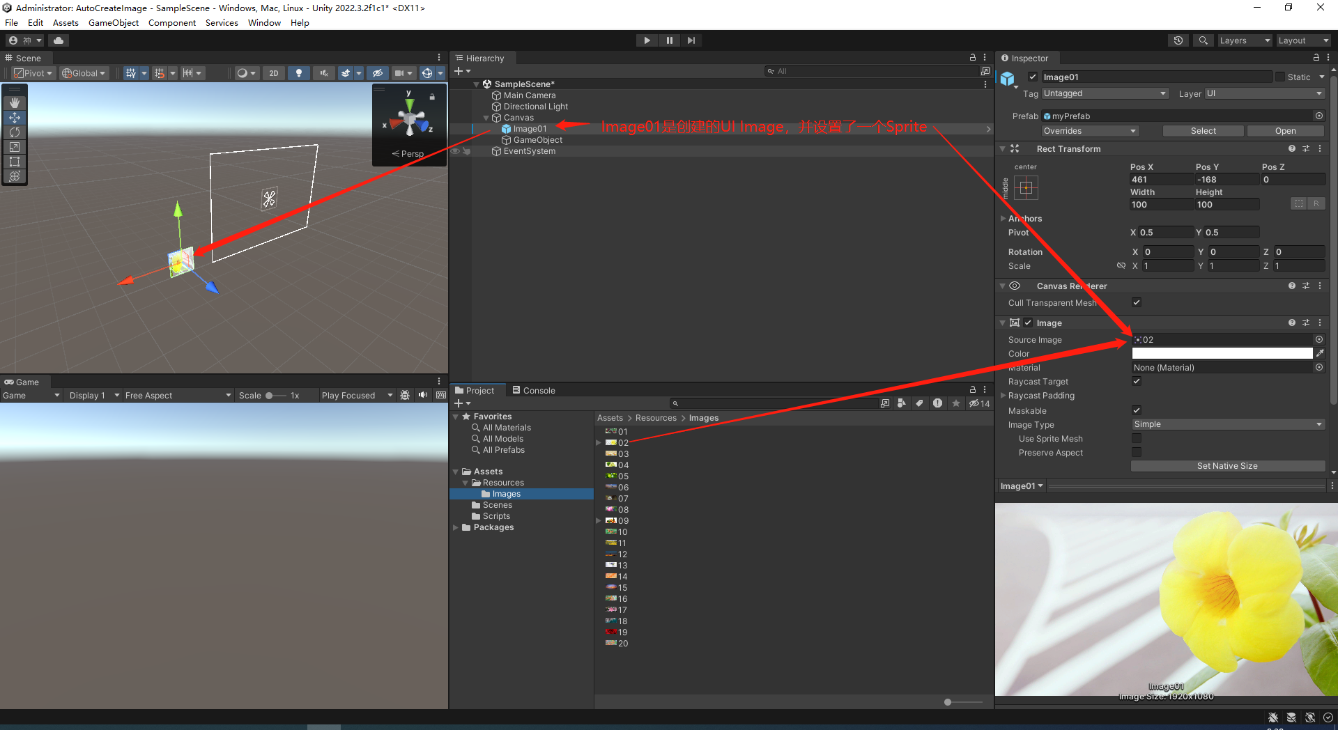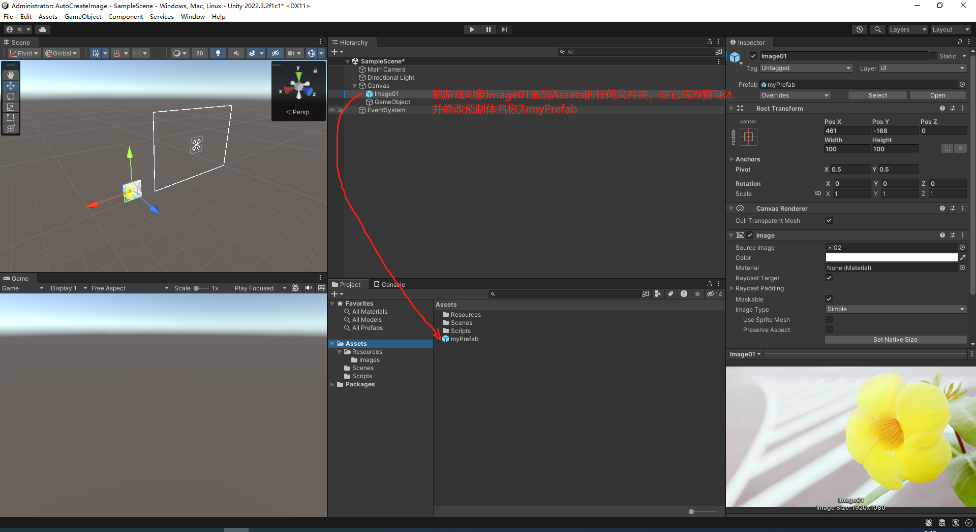 把Image02拖到Assets中,使它成为预制体,并改名为myPrefab