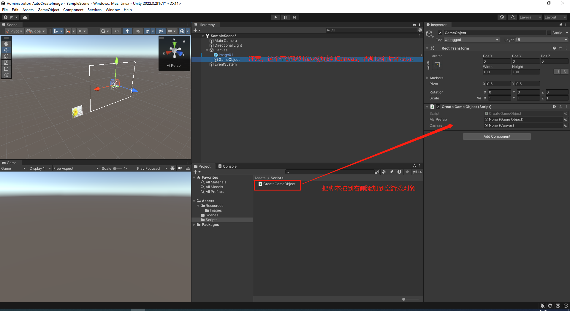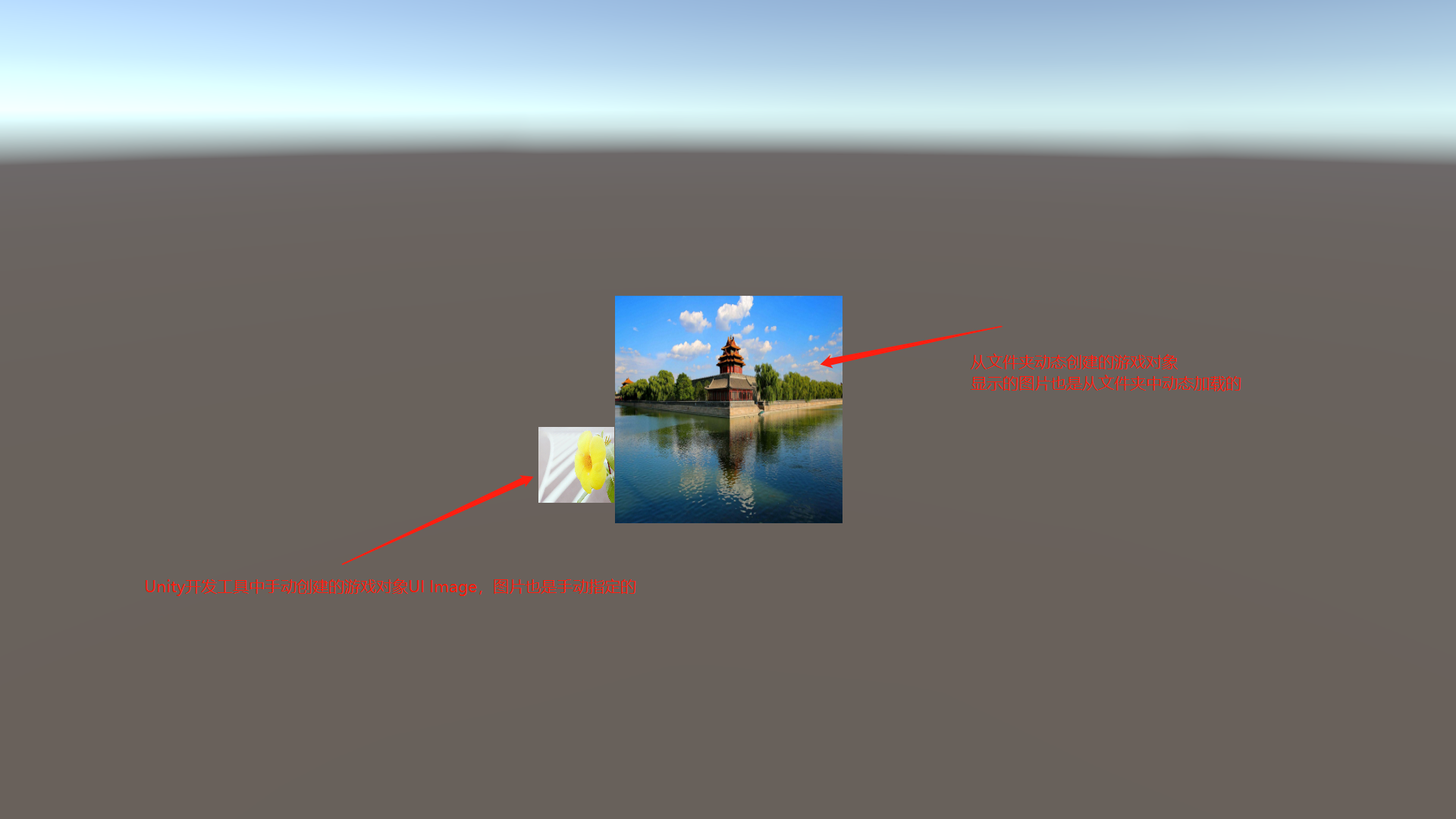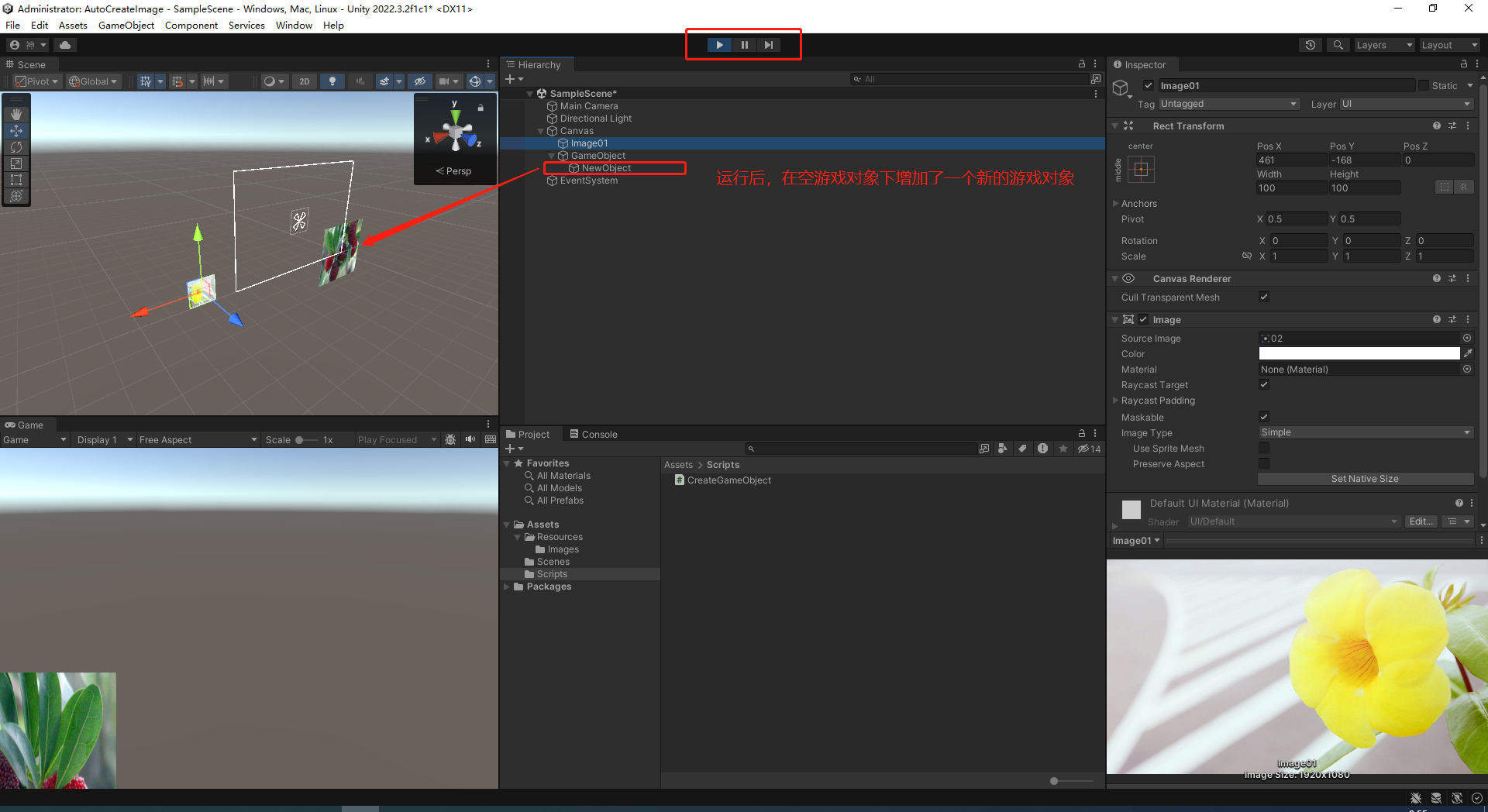 运行成功后,在空游戏对象(挂载了脚本的那个)下动态生成了一个新的游戏对象,同时场景中增加了一个图片显示。