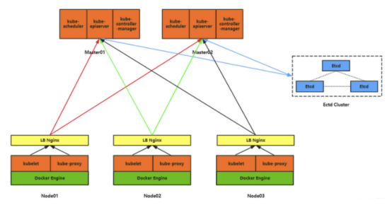 实现原理:通过在每台node节点上安装nginx,由nginx通过内部的负载均衡将node节点上需要通过访问master,kube-apiserver组件的请求,反代到两台k8s-master节点上,这样就可以实现master节点的高可用。当任意一台master节点宕机后,也可以通过nginx负载均衡到另一个master节点上。kube-scheduler以及kube-controller-manager高可用则是在两台master配置文件设置leader-elect参数。