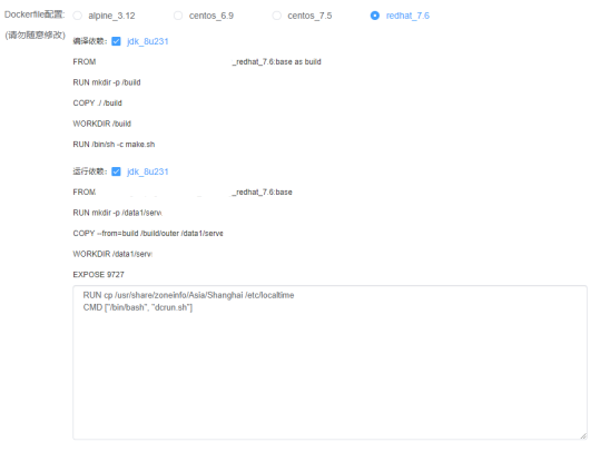 为了业务能更好的使用Kubernetes平台,在平台建设过程中,优化了Dockerfile,业务接入Kubernetes平台无需编写Dockerfile,业务镜像的Dockerfile由平台生成。业务只需在发布项目接入时,勾选镜像系统、程序依赖,填写程序执行命令;程序运行目录,系统等配置自动生成dockerfile。