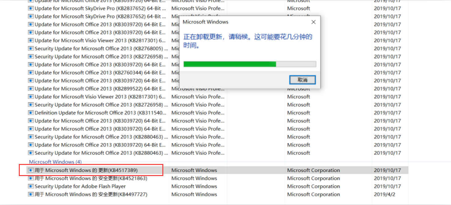 找到更新包 KB4517389,点击鼠标右键,选择卸载,卸载后重启系统,再次尝试打开 VMware。